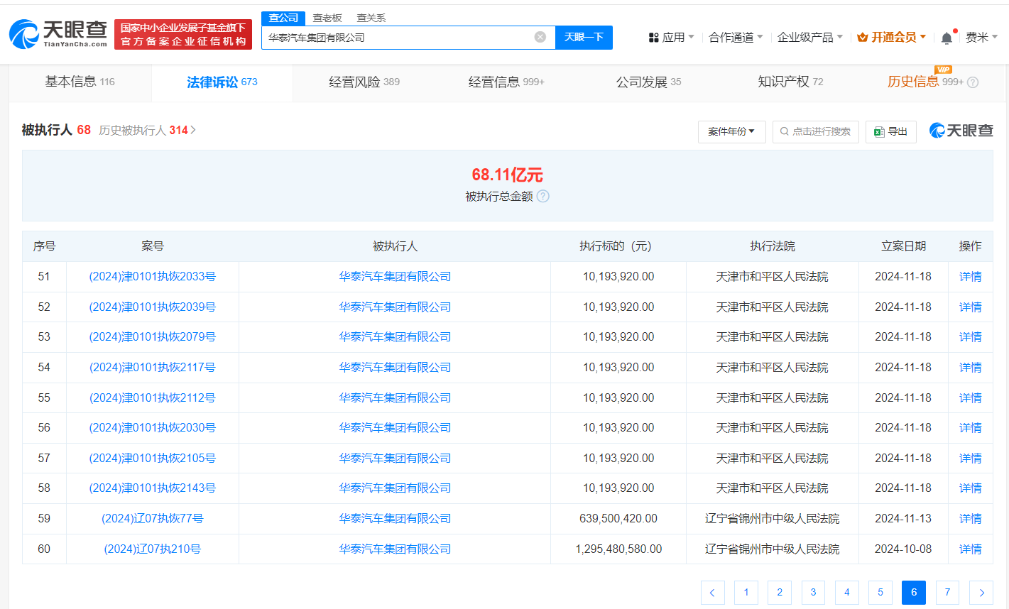 天眼查法律诉讼信息显示,11月18日,华泰汽车集团有限公司新增58条恢复执行信息,执行标的合计6.1亿余元,部分案件被执行人还包括天津华泰汽车车身制造有限公司、天津恒通房地产开发有限公司等,执行法院均为天津市和平区人民法院。