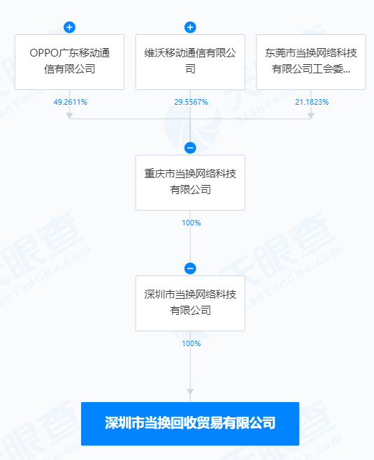天眼查App显示,近日,深圳市当换回收贸易有限公司成立,法定代表人为邓超,注册资本500万人民币,经营范围包括再生资源回收、再生资源销售、信息系统集成服务、电子产品销售、通用设备修理、网络技术服务等。股权全景穿透图显示,该公司由深圳市当换网络科技有限公司全资持股,后者为重庆市当换网络科技有限公司全资子公司。值得一提的是,重庆市当换网络科技有限公司由OPPO广东移动通信有限公司、维沃移动通信有限公司、东莞市当换网络科技有限公司工会委员会共同持股。