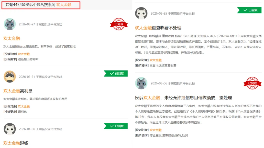 黑猫投诉平台显示,欢太金融累计投诉量超4400条,近30天仍有百条新增投诉,用户投诉核心集中在平台叠加服务费、担保费等隐形费用造成实际年化利率突破监管红线,其次是逾期后存在暴力催收、骚扰紧急联系人等违规行为,同时还存在借贷套娃引流、强制跳转第三方借贷平台、过度搜集个人隐私的问题,叠加客服响应滞后、协商还款及退费诉求推诿无解等问题。