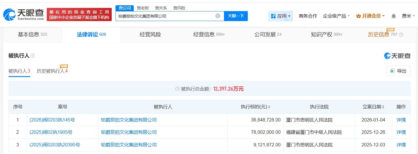 天眼查法律诉讼信息显示,近日,铂爵旅拍文化集团有限公司新增一则被执行人信息,执行标的3684万余元,执行法院为厦门市思明区人民法院。
