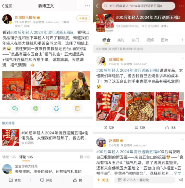从热度高涨的“00后年轻人2024年流行送新五福”微博话题,以及消费者戏称“良品铺子与年轻人对齐了颗粒度”来看,良品铺子此举正在收获预期中的正反馈。