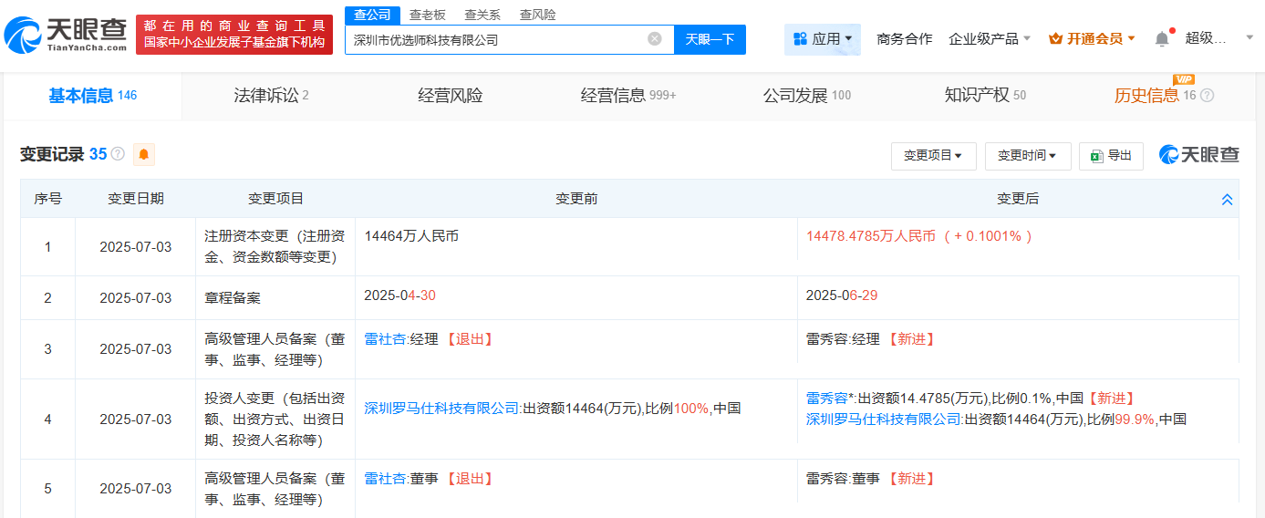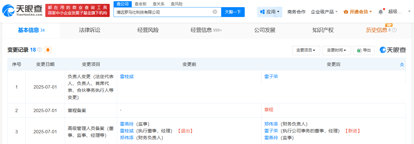 天眼查App显示,近日,清远罗马仕科技有限公司发生工商变更,罗马仕创始人雷桂斌卸任法定代表人、执行董事、经理,由雷子荣接任。