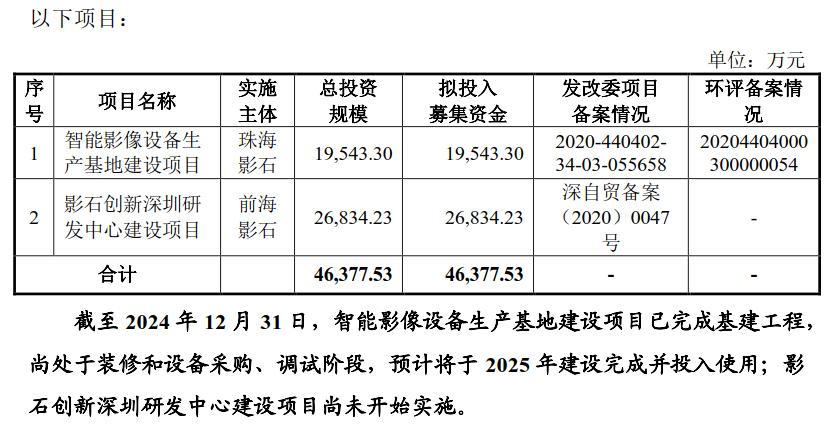 据影石创新2025版招股书注册稿,公司拟募集46,377.53万元分别用于“智能影像设备生产基地建设项目”以及“影石创新深圳研发中心建设项目”,上述两个项目均在2020年备案,其中智能影像设备生产基地建设项目已完成基建工程,尚处于装修和设备采购、调试阶段,预计将于2025年建设完成并投入使用;影石创新深圳研发中心建设项目尚未开始实施。
