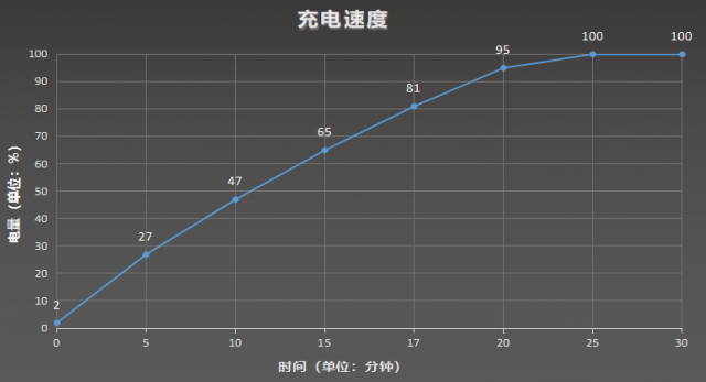 在实际充电测试中,该机5分钟便可充入27%,10分钟可充满47%,完全充满也仅需25分钟,与官方公布的时间基本一致,这一充电速度可以让你在任何空余的时间轻松将电池充满。