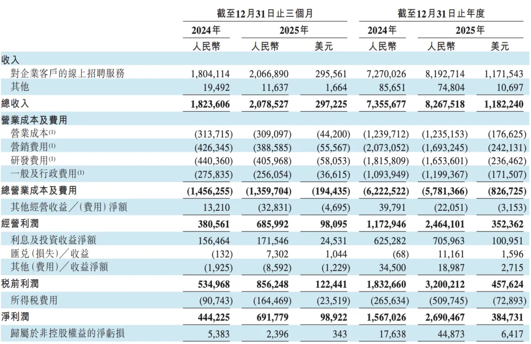 收入来源很简单,主要来自企业客户招聘。2025年全年该板块收入81.93亿元,同比提高 12.7%。付费企业客户数同比增长11.5%至680万,客户规模正在不断扩大。