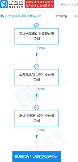 企查查股权穿透显示,该公司由深圳市腾娱互动科技有限公司100%控股,后者为成都腾讯新文创科技有限公司全资子公司。