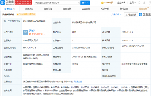 【TechWeb】企查查APP显示,11月25日,杭州腾娱互动科技有限公司成立,法定代表人为罗海波,注册资本1000万元人民币,经营范围包含:科技中介服务;企业管理咨询;会议及展览服务;计算机软硬件及辅助设备零售等。