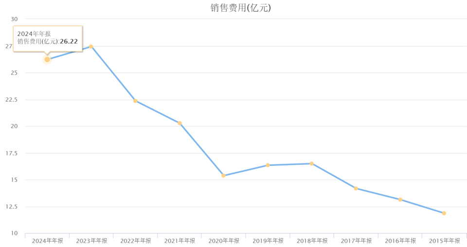 研发费用高企的同时,销售费用也居高不下,2024年,用友销售费用为26.22亿元,同比下降了4.42%,但仍处于高位;2021年至2023年,其销售费用同比分别增长31.95%、10.26%、22.70%。
