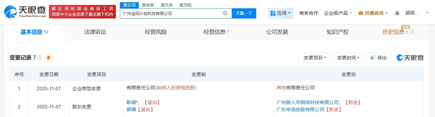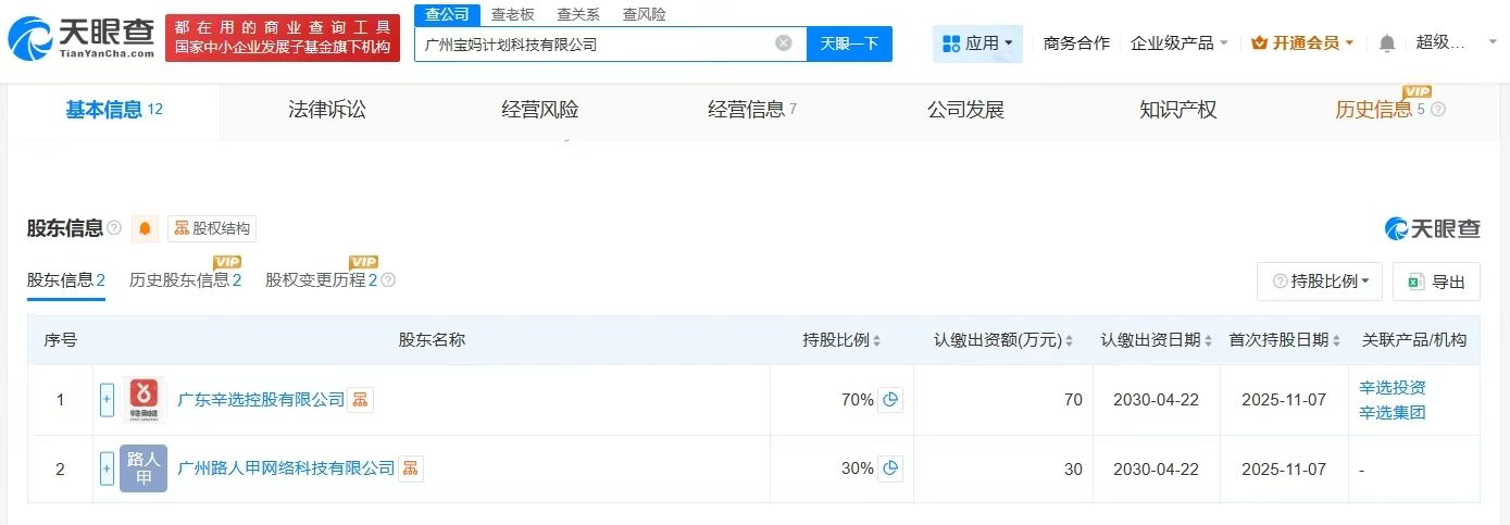 天眼查工商信息显示,近日,广州宝妈计划科技有限公司发生工商变更,原股东退出,新增广东辛选控股有限公司、广州路人甲网络科技有限公司为股东。