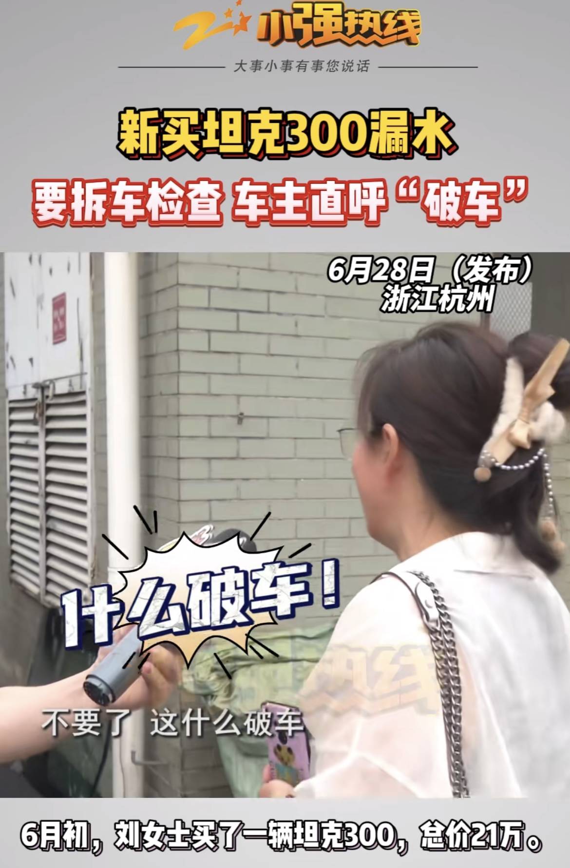 据小强热线浙江教科报道,6月初,刘女士买了一辆坦克300,总价21万。最近她发现车内有两处漏水点,4S店称需要拆掉车子的内饰检查。刘女士无法接受。