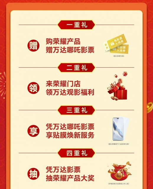 购机优惠享不停,门店福利赢到爽!即日起前往荣耀门店参与活动,有机会赢得限量哪吒周边,更有电影新角色专属周边等你解锁,快来把心仪已久的“哪吒”与荣耀新机一起抱回家。同时,荣耀携手万达电影,为喜欢“哪吒”的消费者带来四重观影福利,囊括购荣耀产品赠万达哪吒影票、来荣耀门店领万达观影福利、凭万达哪吒影票享贴膜焕新服务,以及凭万达影票抽荣耀产品大奖。解锁更多互动惊喜,尽在荣耀门店。