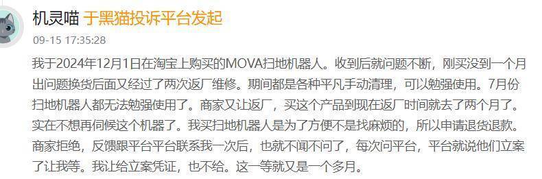 在黑猫投诉等消费者服务平台上,关于MOVA产品的投诉层出不穷。“实在不想再伺候这个机器了,我买扫地机器人是为了方便,不是找麻烦的。”在消费者服务平台黑猫投诉上,有消费者提到自己与MOVA扫地机器人之间的反复拉扯:我于2024年12月1日在淘宝上购买的MOVA扫地机器人。收到后就问题不断,刚买没到一个月出问题换货后面又经过了两次返厂维修。期间都是各种频繁手动清理,可以勉强使用。(2025年)7月份扫地机器人都无法勉强使用了,商家又让返厂……