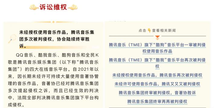 尽管腾讯音乐在其ESG报告中强调高度重视版权合规工作,与厂牌、版权集体管理组织合作获完整授权,建立合同履约跟踪与版权审核机制等方式避免侵权,并通过数字水印、区块链、AI 技术构建全链条防护体系等维护自身版权,但其与国内唯一的音乐著作权集体管理组织—中国音乐著作权协会之间的关系却一度陷入紧张。