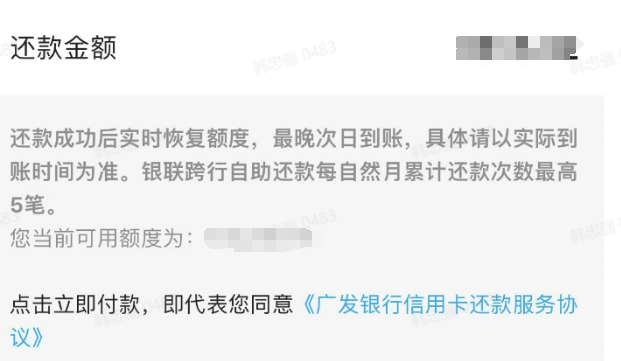 不仅如此,按照前述客服表达的意思,用户在最后还款日24点前还款即可免去扣费麻烦,但广发信用卡App还款界面显示,“还款成功后实时恢复额度,最晚次日到账,具体请以实际到账时间为准。”也就是说,虽然用户在还款日当天还款,但是未必当天就能到账成功,最晚情况下还款的次日才到账。