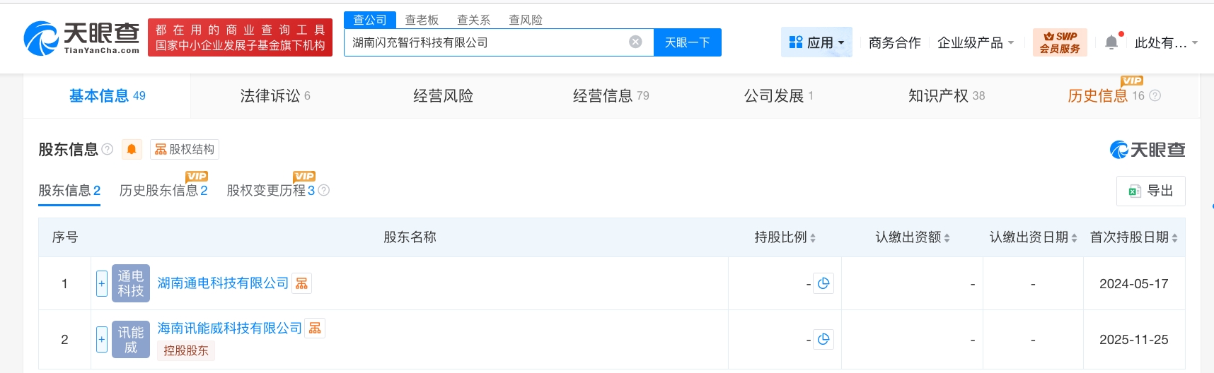 该公司成立于2024年5月,法定代表人为文玲,经营范围包括充电桩销售、集中式快速充电站、电池销售等。股东信息显示,该公司由海南讯能威科技有限公司、湖南通电科技有限公司共同持股。