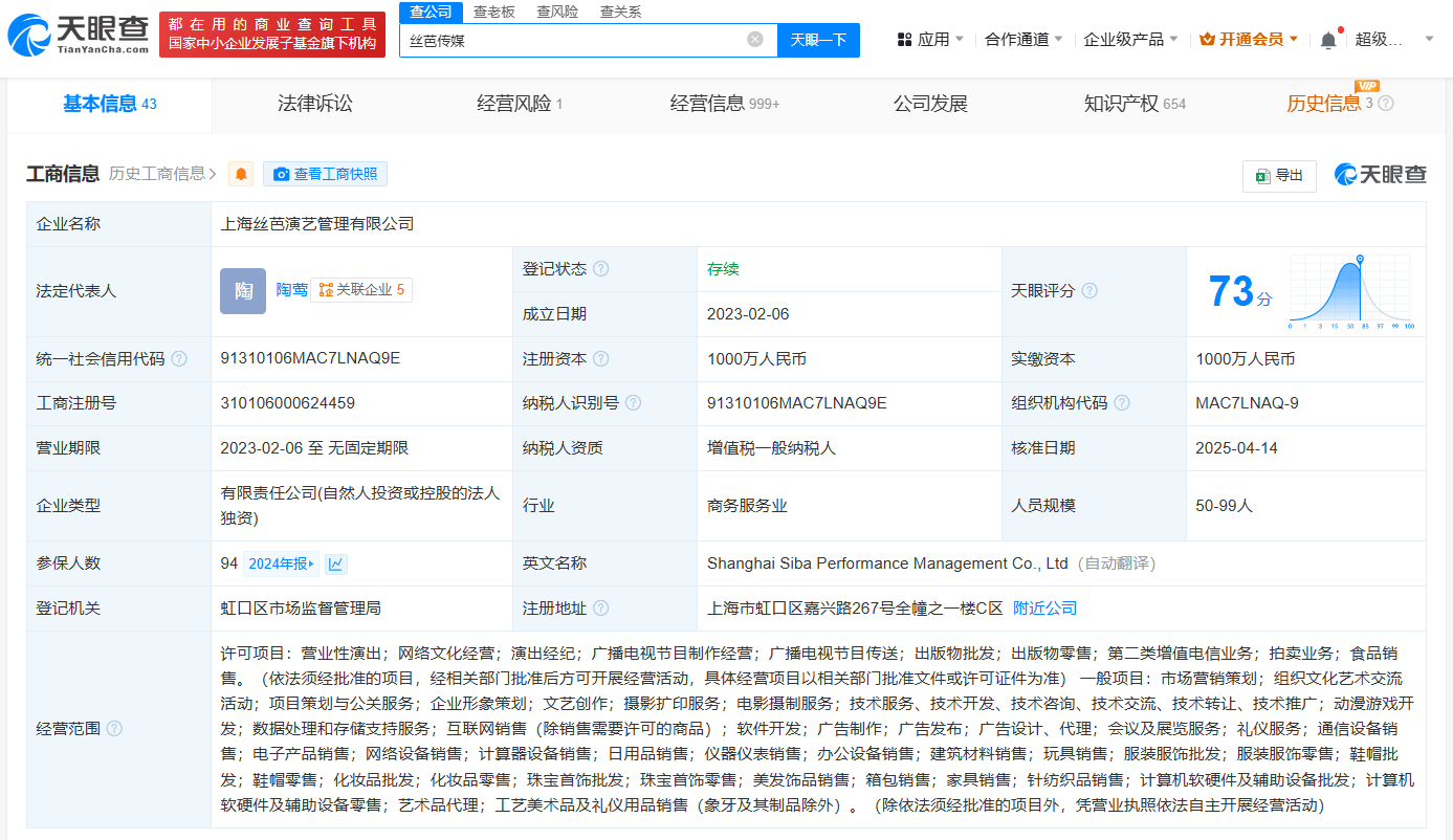 天眼查App显示,上海丝芭演艺管理有限公司已成功注册多枚“赵粤”商标,国际分类涉及广告销售、方便食品、布料床单等。该公司成立于2023年2月,法定代表人为陶莺,注册资本1000万人民币,经营范围包括营业性演出、网络文化经营、演出经纪、广播电视节目制作经营等,由上海丝芭文化传媒集团有限公司全资持股。