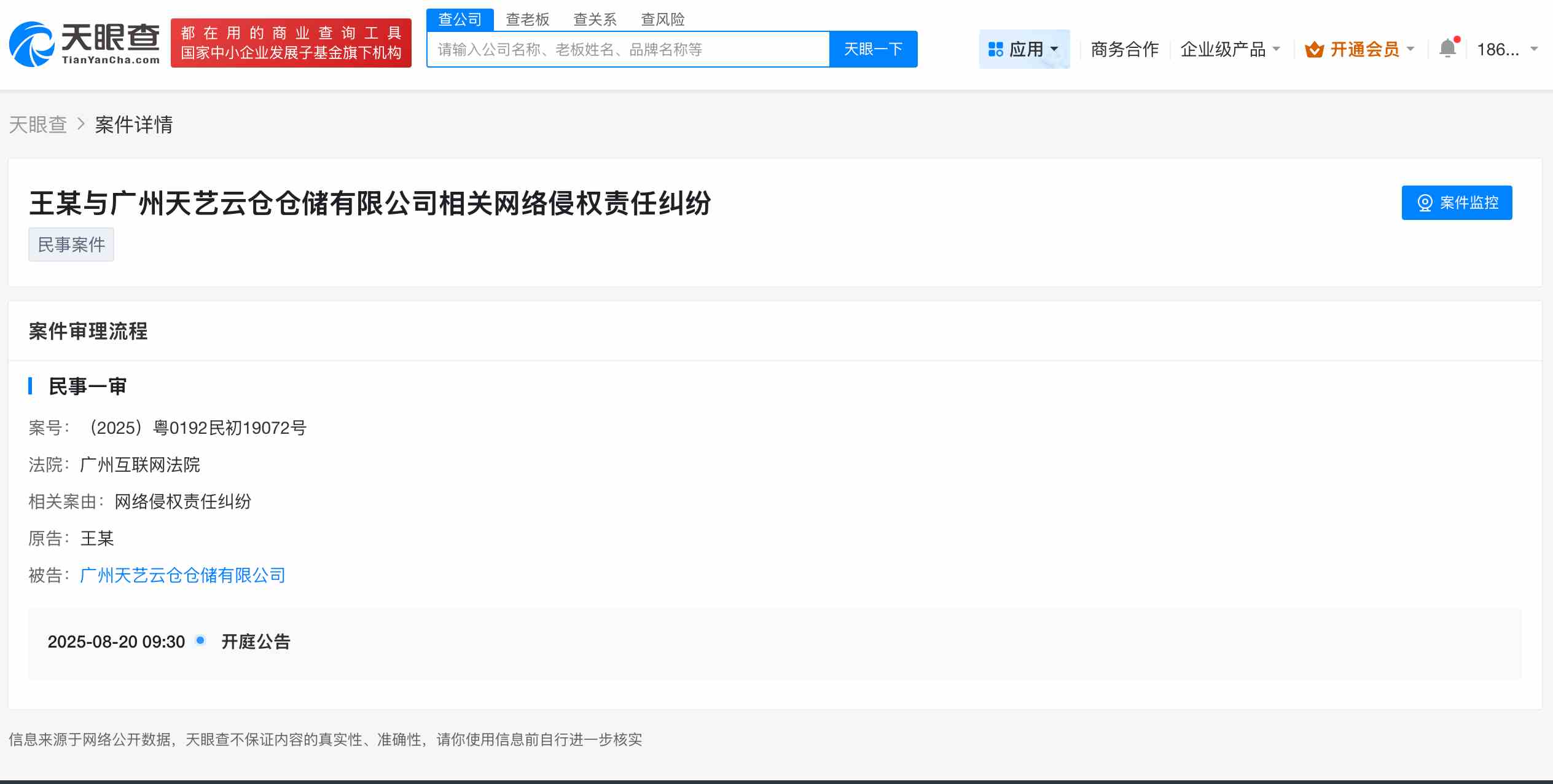 天眼查法律诉讼信息显示,此前,王俊凯与广州天艺云仓仓储有限公司相关网络侵权责任纠纷案已于8月20日开庭审理。