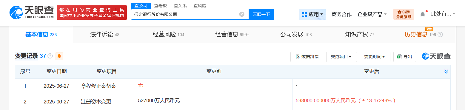 天眼查App显示,近日,保定银行股份有限公司发生工商变更,注册资本由52.7亿人民币增至59.8亿人民币,增幅约13%。