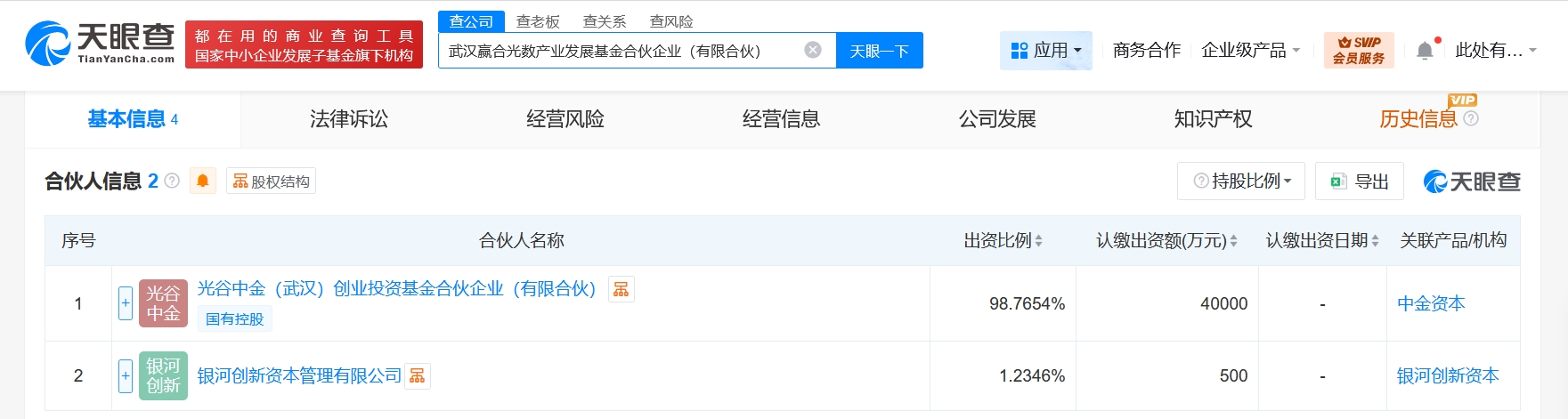 天眼查App显示,近日,武汉赢合光数产业发展基金合伙企业(有限合伙)成立,执行事务合伙人为银河创新资本管理有限公司,出资额4.05亿人民币,经营范围为创业投资,私募股权投资基金管理、创业投资基金管理服务。合伙人信息显示,该基金由光谷中金(武汉)创业投资基金合伙企业(有限合伙)、中国银河(601881)旗下银河创新资本管理有限公司共同出资。
