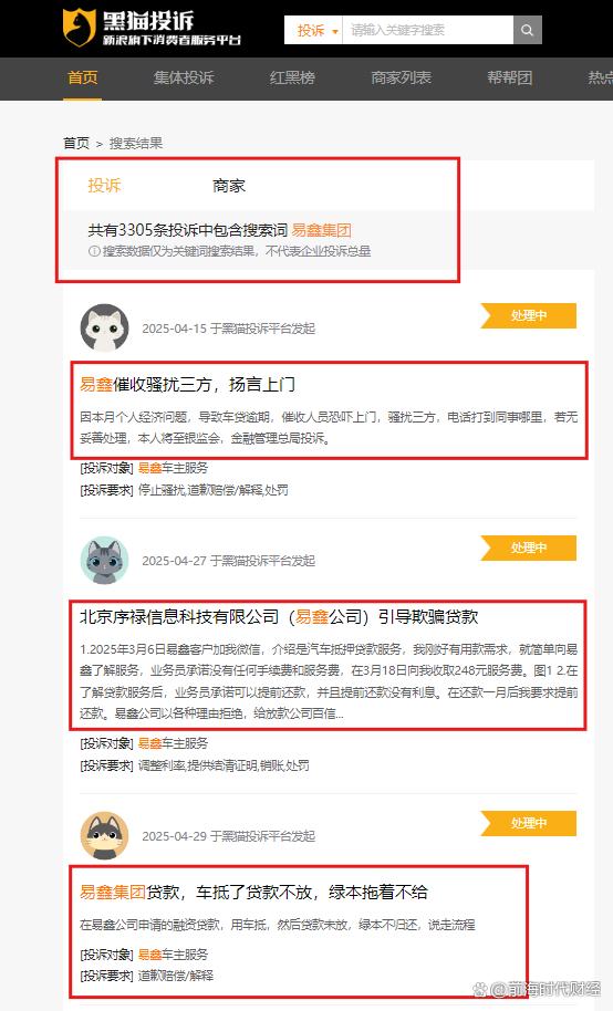 然而,与这份被资本市场热捧的“成绩单”形成强烈反差的是,截至2025年5月14日,黑猫投诉平台(新浪旗下消费者服务平台)累计收到针对易鑫集团的投诉量已突破3300条,大部分涉及“暴力催收”,凸显出用户的血泪史。