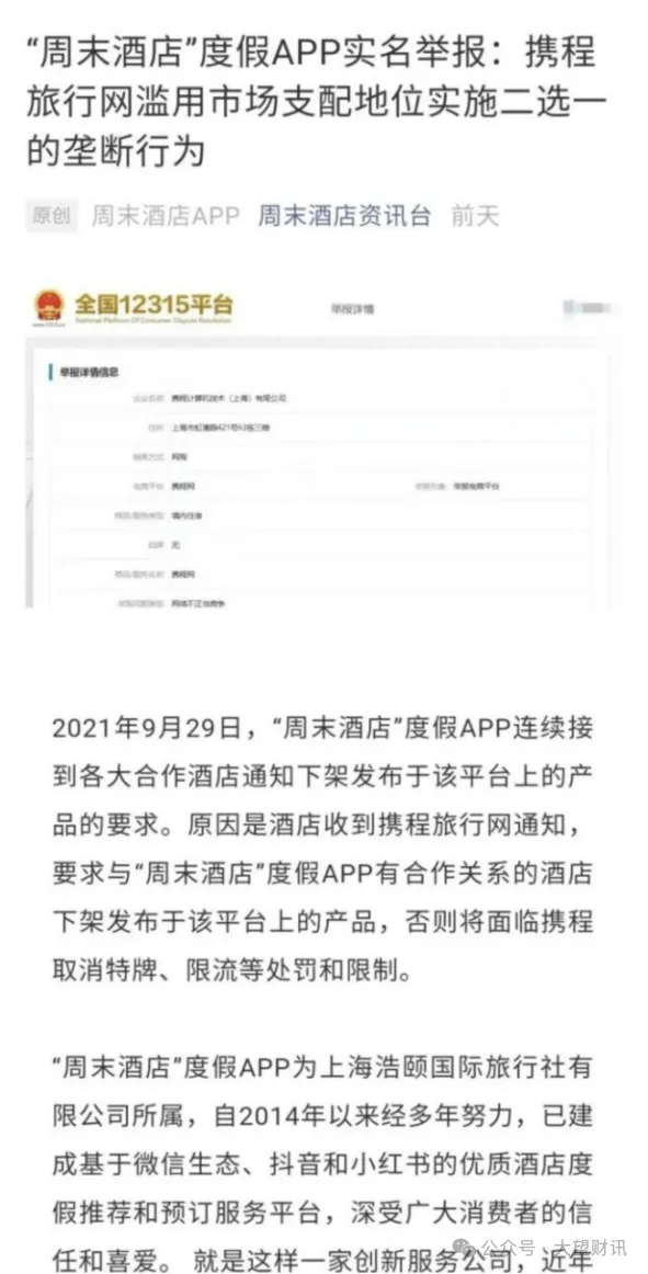 实际上,对携程“二选一”行为的指控并非首次。早在2021年国庆黄金周期间,周末酒店App就在12315平台举报携程,称合作酒店迫于携程压力下架其产品。