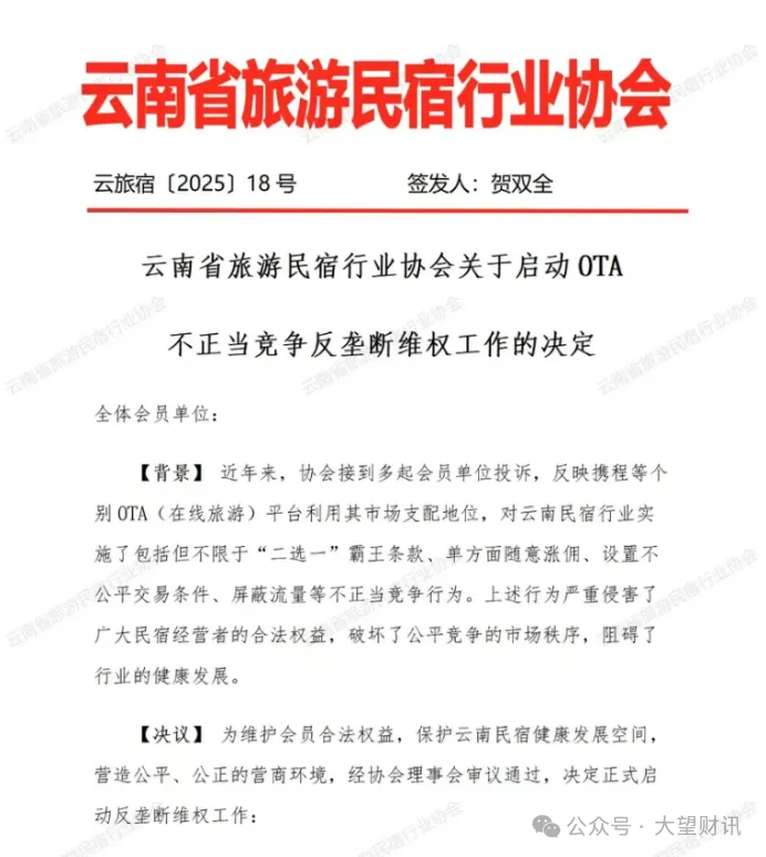 文章指出,近年来,该协会接到多起会员单位投诉,反映携程等个别OTA(在线旅游)平台利用其市场支配地位,对云南民宿行业实施了包括但不限于“二选一”霸王条款、单方面随意涨佣、设置不公平交易条件、屏蔽流量等不正当竞争行为。上述行为侵害了广大民宿经营者的合法权益,破坏了公平竞争的市场秩序,阻碍了行业的健康发展。