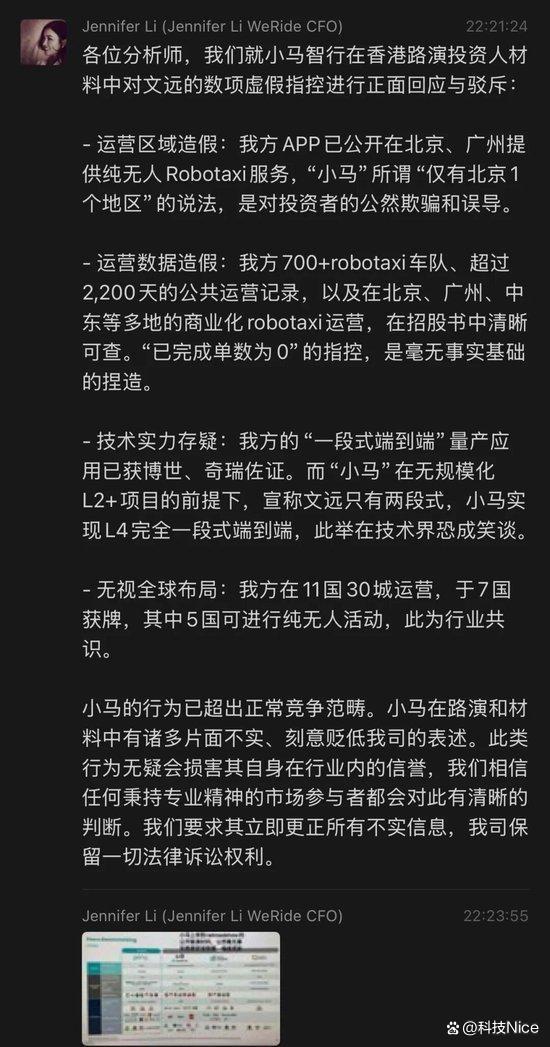 文远知行CFO李璇于10月30日晚在分析师群内发布长文,直指小马智行在港股路演材料中对文远知行存在“运营区域造假”“运营数据造假”“技术实力存疑”等多项不实指控,并要求对方立即更正信息,否则将采取法律行动。