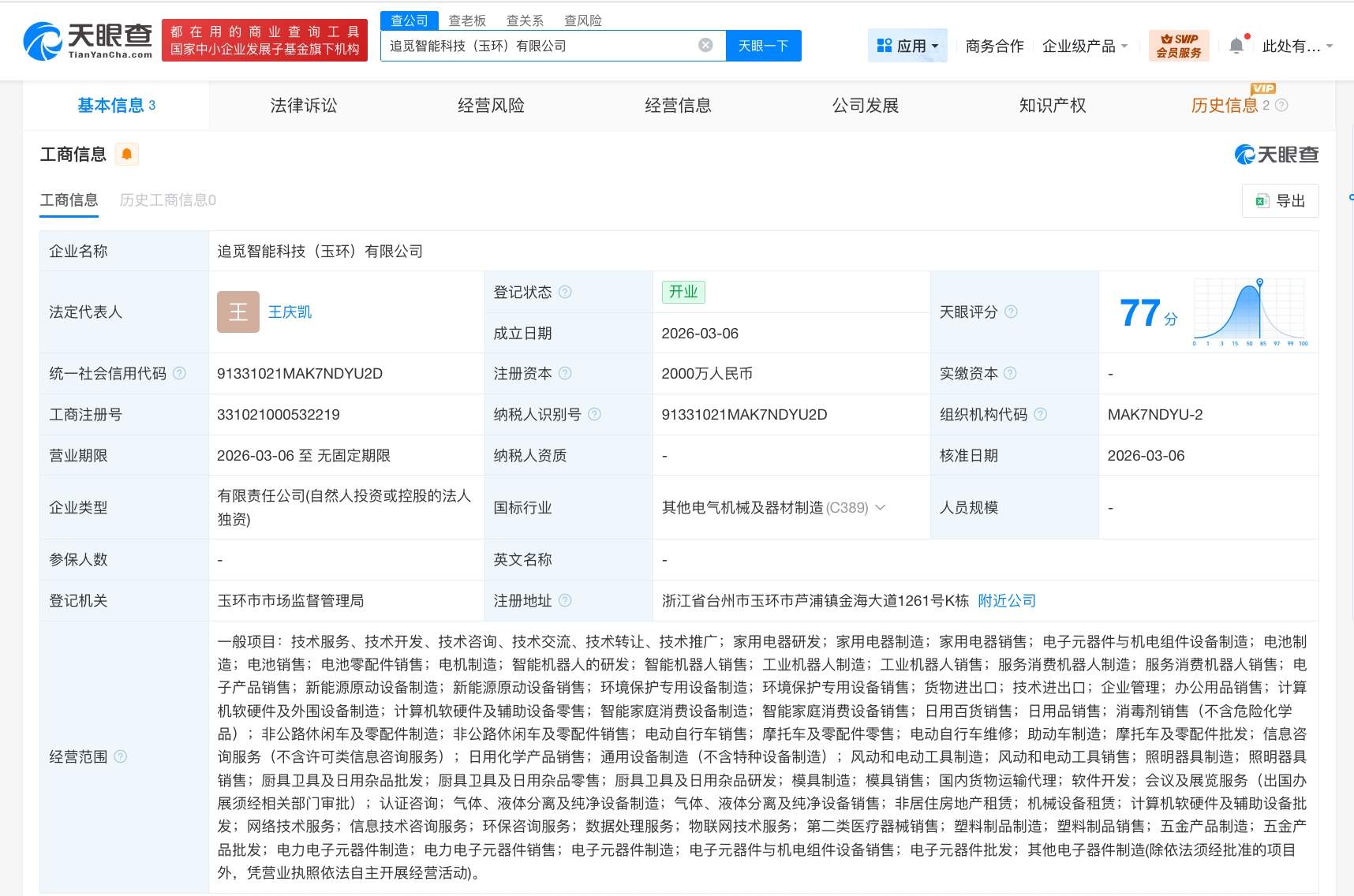 3月6日,追觅智能科技(玉环)有限公司成立,法定代表人为王庆凯,注册资本2000万人民币,经营范围包括智能机器人的研发、家用电器研发、工业机器人制造、服务消费机器人制造等。股东信息显示,该公司由追觅科技旗下追觅创新科技(苏州)有限公司全资持股。