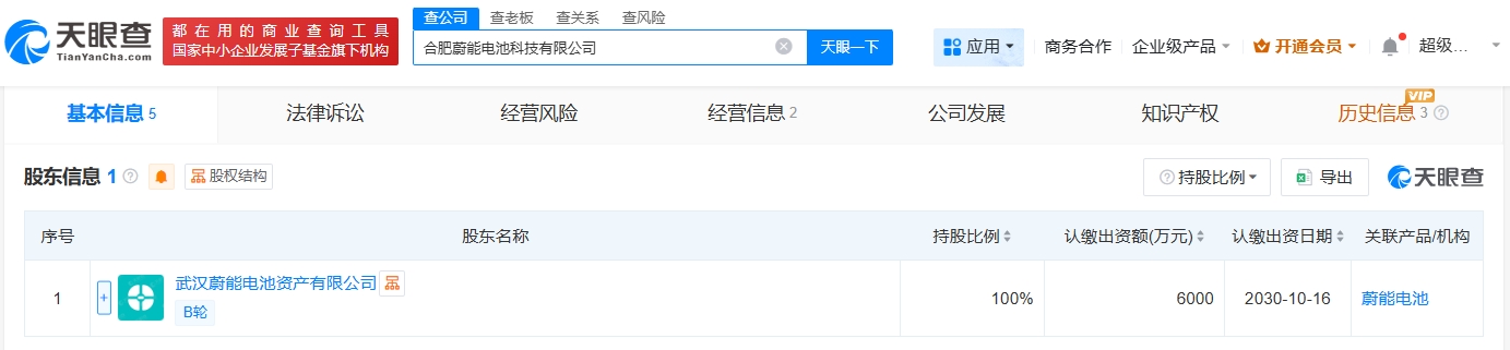 天眼查App显示,近日,合肥蔚能电池科技有限公司成立,法定代表人为赖晓明,注册资本6000万人民币,经营范围包括蓄电池租赁、电动汽车充电基础设施运营、新能源汽车废旧动力蓄电池回收及梯次利用等。股东信息显示,该公司由武汉蔚能电池资产有限公司全资持股。