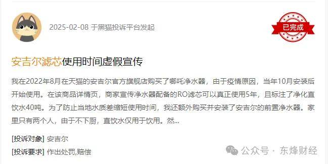 如今,安吉尔已经深陷信任危机之中。天眼查App显示,在黑猫投诉平台上,关于安吉尔的投诉已经超过830条,涉及产品质量、售后服务、滤芯争议等多个方面。这些投诉不仅是对安吉尔品牌形象的巨大打击,更是对其未来发展的严峻挑战。