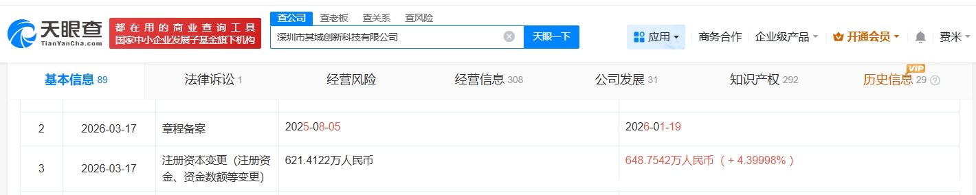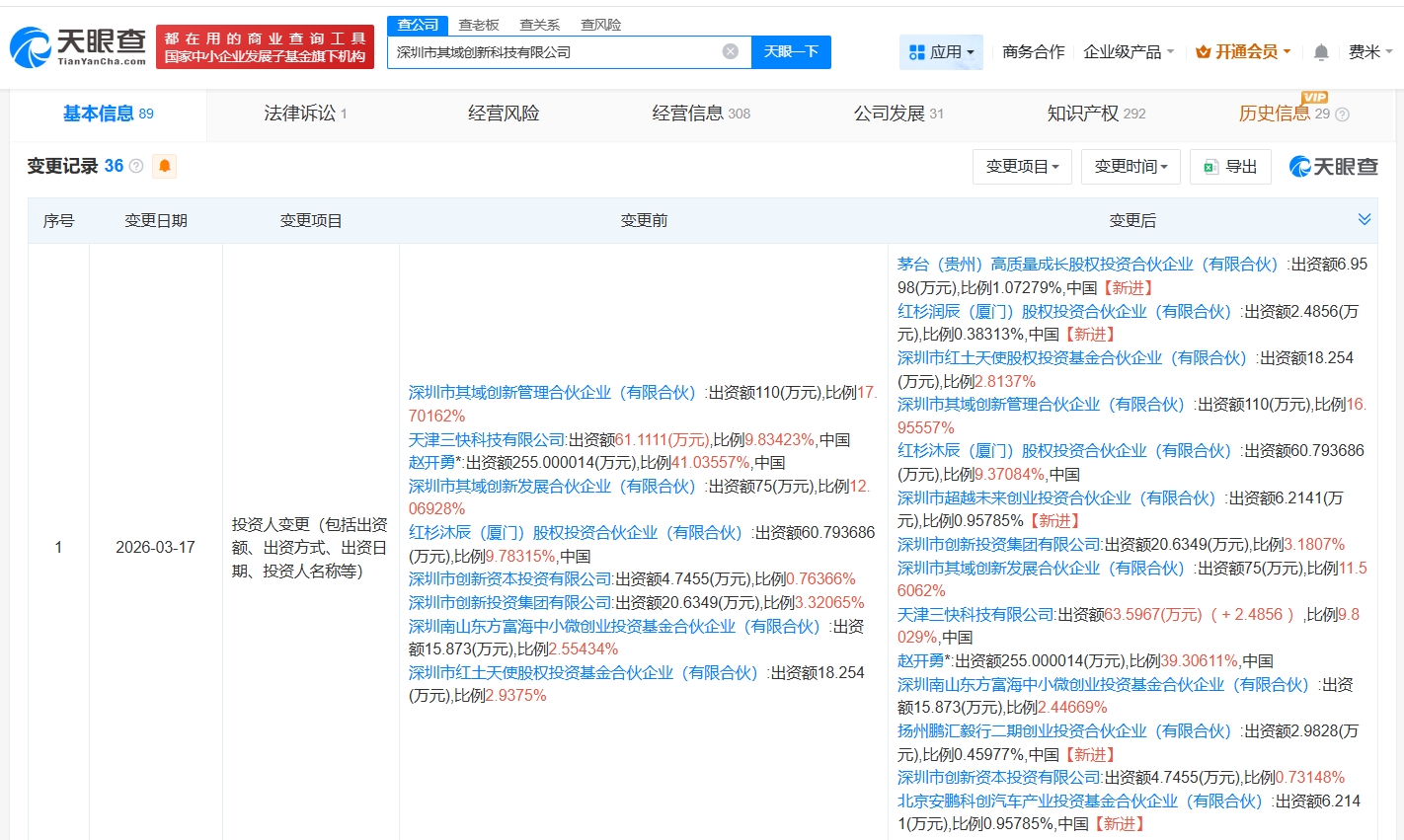 近日,深圳市其域创新科技有限公司发生工商变更,新增茅台(贵州)高质量成长股权投资合伙企业(有限合伙)、北汽旗下北京安鹏科创汽车产业投资基金合伙企业(有限合伙)等为股东,同时,注册资本由约621.4万人民币增至约648.8万人民币。