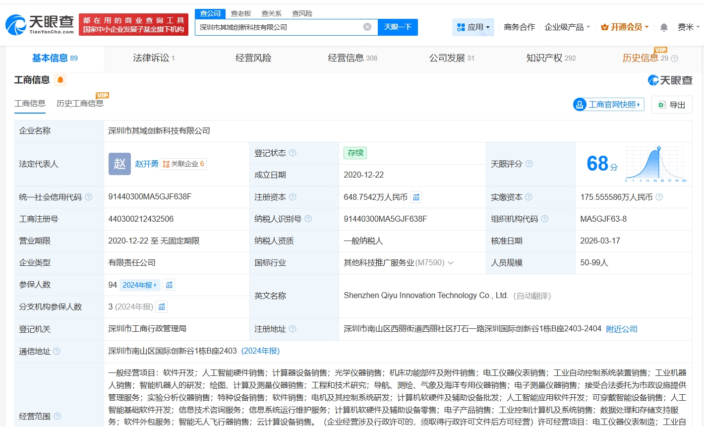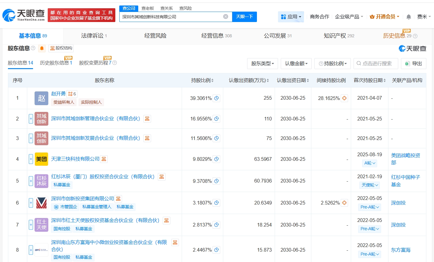 深圳市其域创新科技有限公司成立于2020年12月,法定代表人为赵开勇,经营范围含软件开发、人工智能硬件销售、工业机器人销售等。股东信息显示,该公司现由赵开勇、美团旗下天津三快科技有限公司及上述新增股东等共同持股。公开资料显示,该公司是一家提供智能三维技术服务的企业。