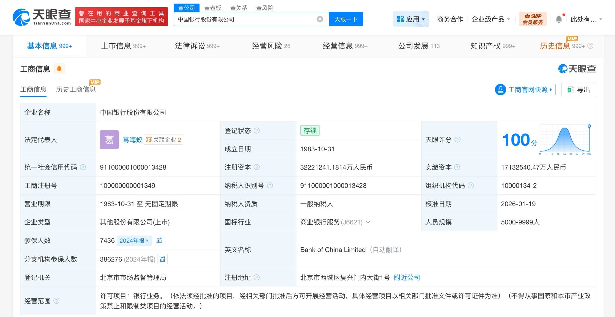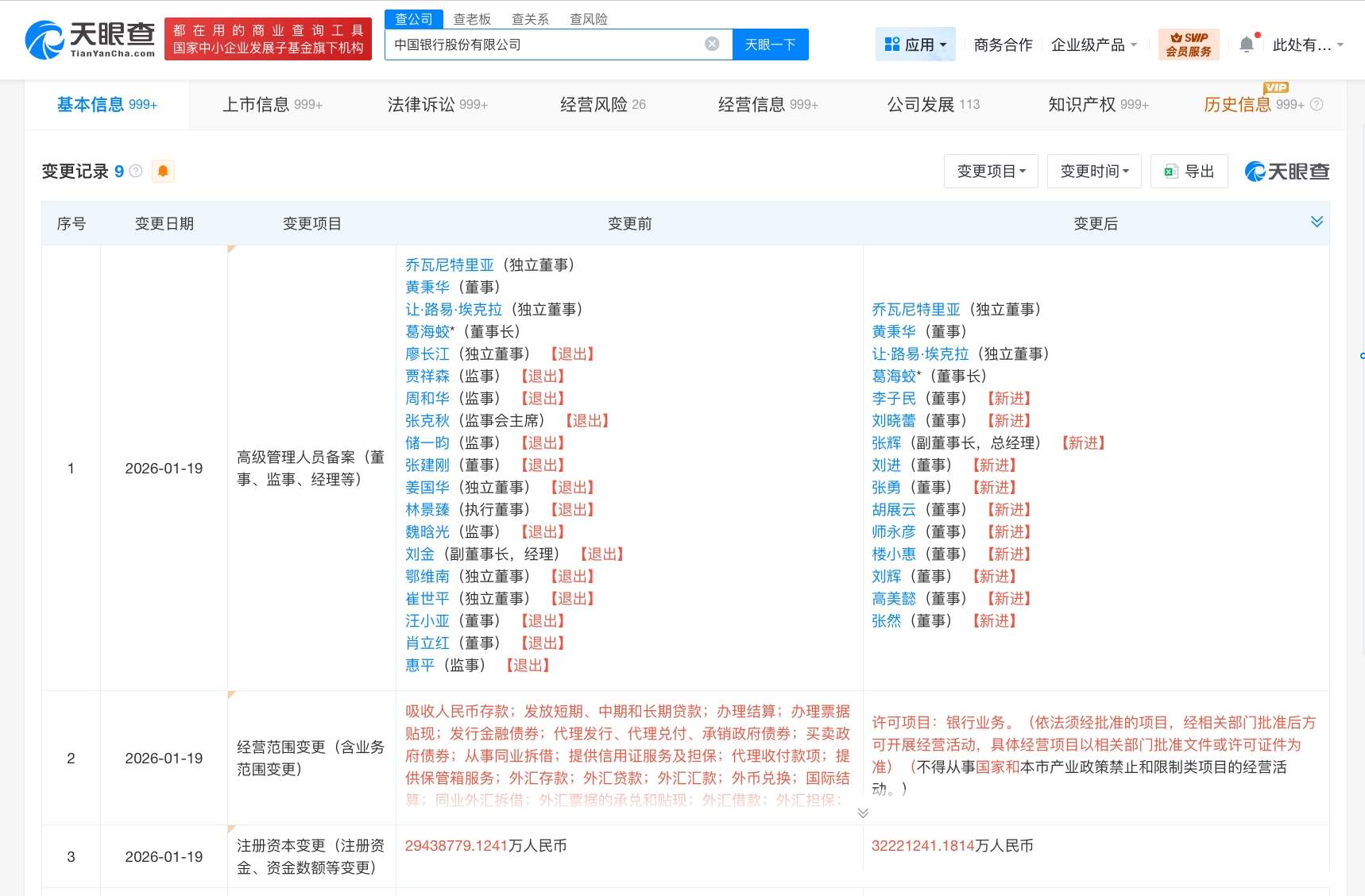 天眼查工商信息显示,近期,中国银行(601988)发生工商变更,注册资本由约2944亿人民币增至约3222亿人民币,增幅约9.5%。