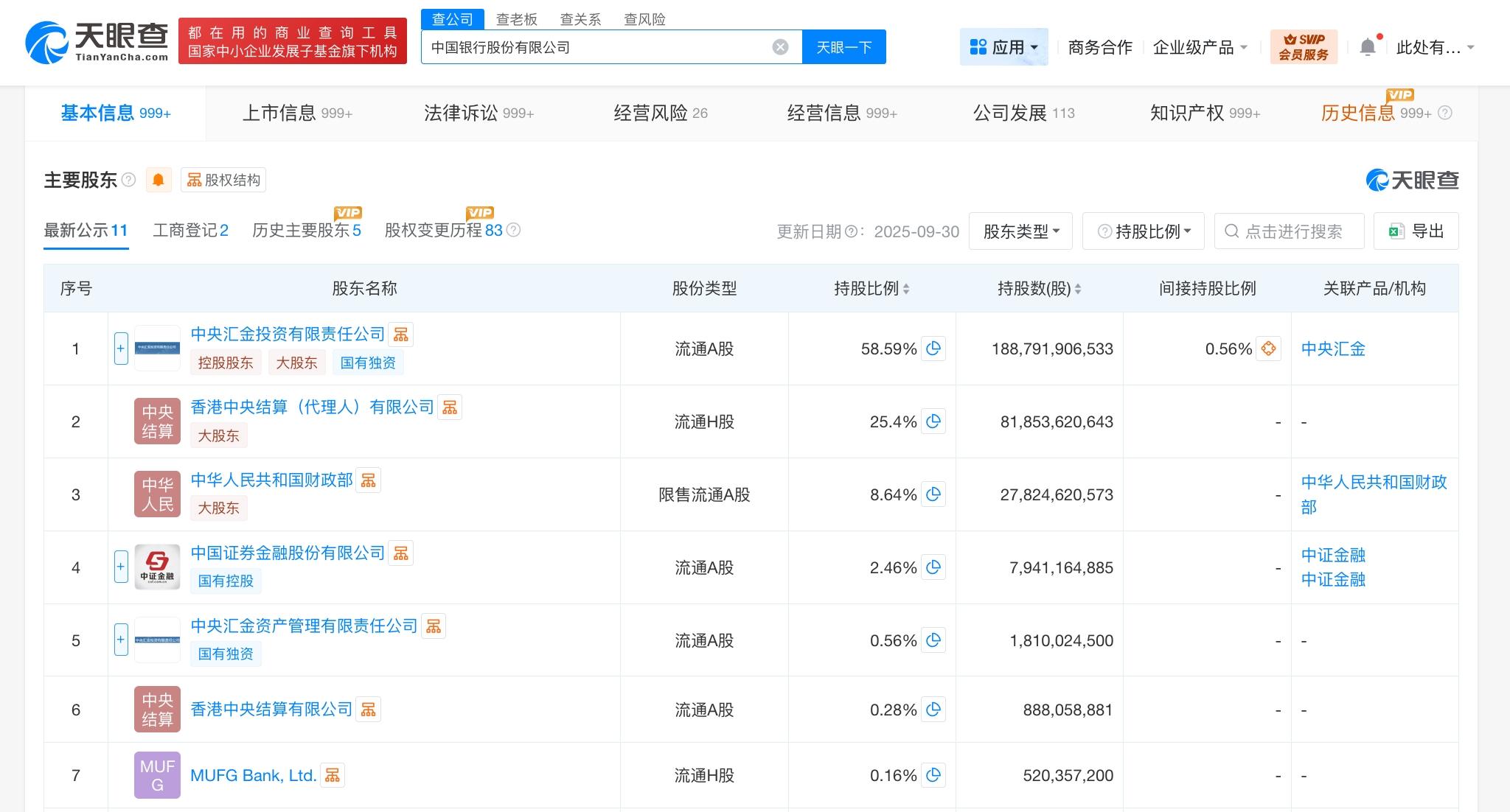 中国银行股份有限公司成立于1983年10月,法定代表人为葛海蛟,经营范围为银行业务。股东信息显示,该公司由中央汇金投资有限责任公司、香港中央结算(代理人)有限公司、中华人民共和国财政部、中国证券金融股份有限公司等共同持股。