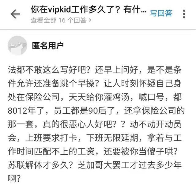 有VIPKID离职员工说,面试冲着教育行业去的,应聘的是非销售岗位,录用后结果硬生生做成了销售。VIPKID所谓的“班主任”就是课程顾问,即卖课人员。天天灌鸡汤、喊口号,完全一派保险公司的做法。