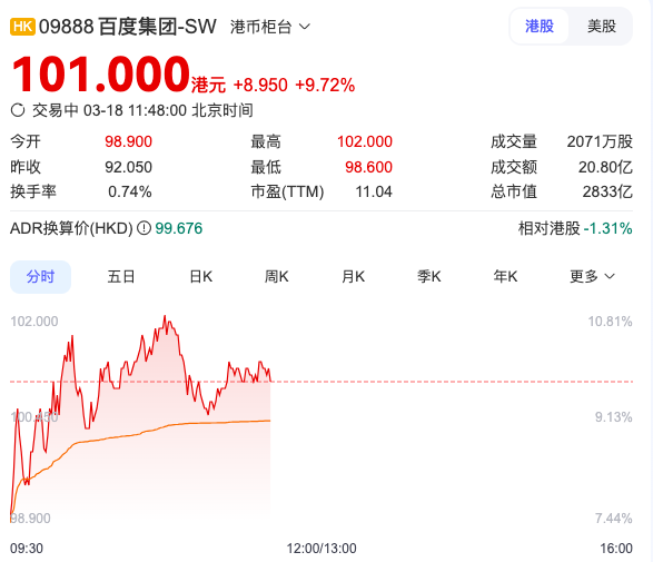 【TechWeb】3月18日消息,港股百度集团股价重回100元大关。截至11时48分,该股涨9.72%,报101.港元/股。