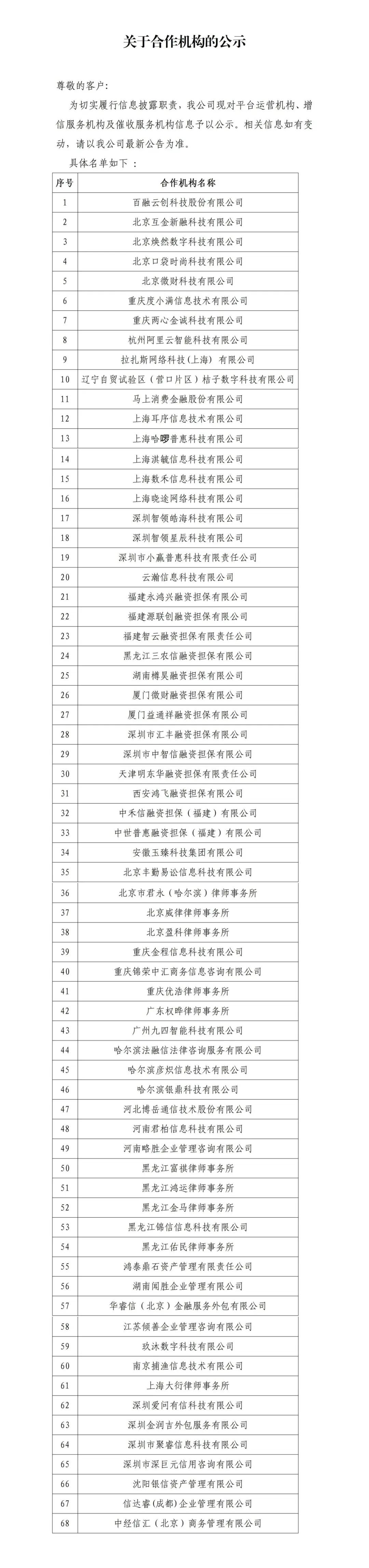 目前,哈银消金仍与多达68家合作机构,其中包括度小满、阿里云、哈啰普惠、马上消费、桔子数字科技等公司,具体如下图所示。