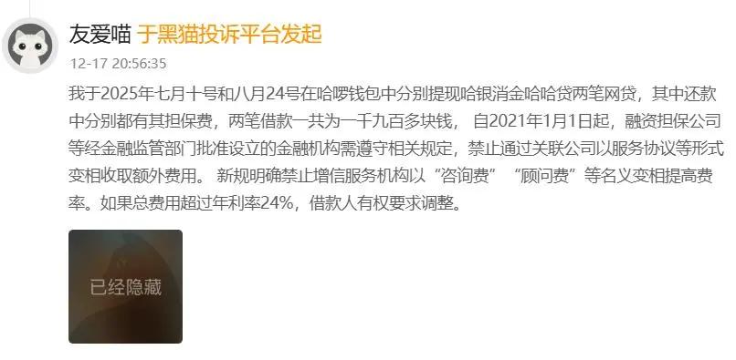 2025年12月17日,一位消费者在黑猫投诉平台投诉到:“我于2025年7月10日和8月24日在哈啰钱包分别提现哈银消金哈哈贷两笔网贷,合计金额一千九百余元,还款中均包含担保费;自2021年1月1日起,融资担保公司等经金融监管部门批准设立的金融机构不得通过关联公司以服务协议等形式变相收取额外费用,增信服务机构禁止以‘咨询费’‘顾问费’等名义变相提高费率,若总费用超过年利率24%,借款人有权要求调整。”