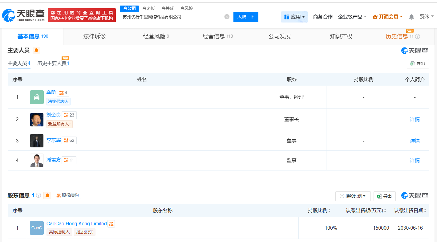 该公司成立于2021年12月,法定代表人为龚昕,经营范围包括人工智能应用软件开发、网络与信息安全软件开发、小微型客车租赁经营服务等,由曹操出行关联公司CaoCao Hong Kong Limited全资持股。