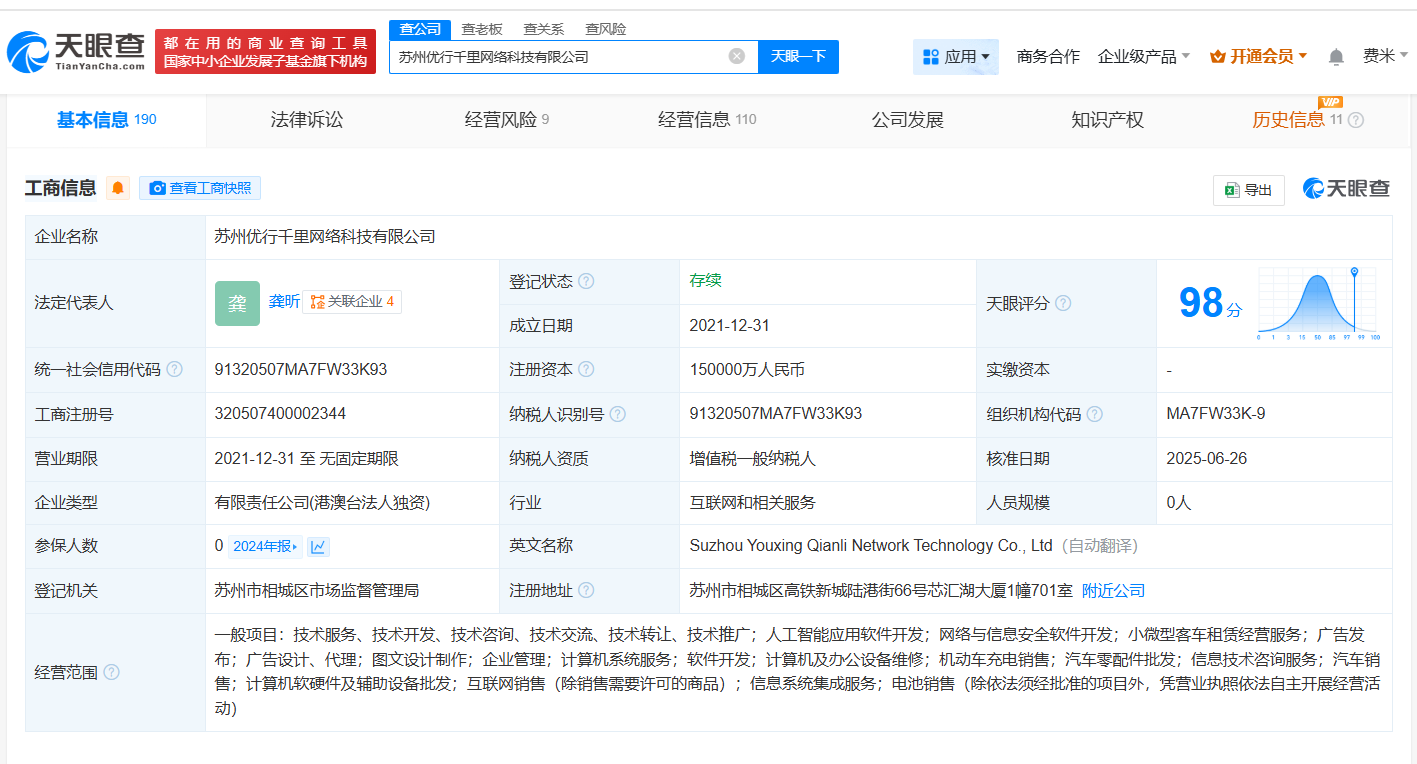 天眼查App显示,近日,苏州优行千里网络科技有限公司发生工商变更,注册资本由1000万人民币增至15亿人民币,增幅14900%。