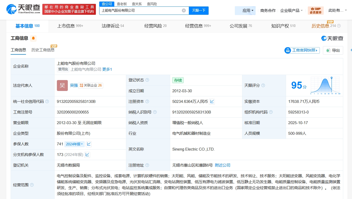 天眼查工商信息显示,近日,上能电气(300827)发生工商变更,注册资本由约3.58亿人民币增至约5.02亿人民币,增幅约40%,同时,多位主要人员均发生变更。