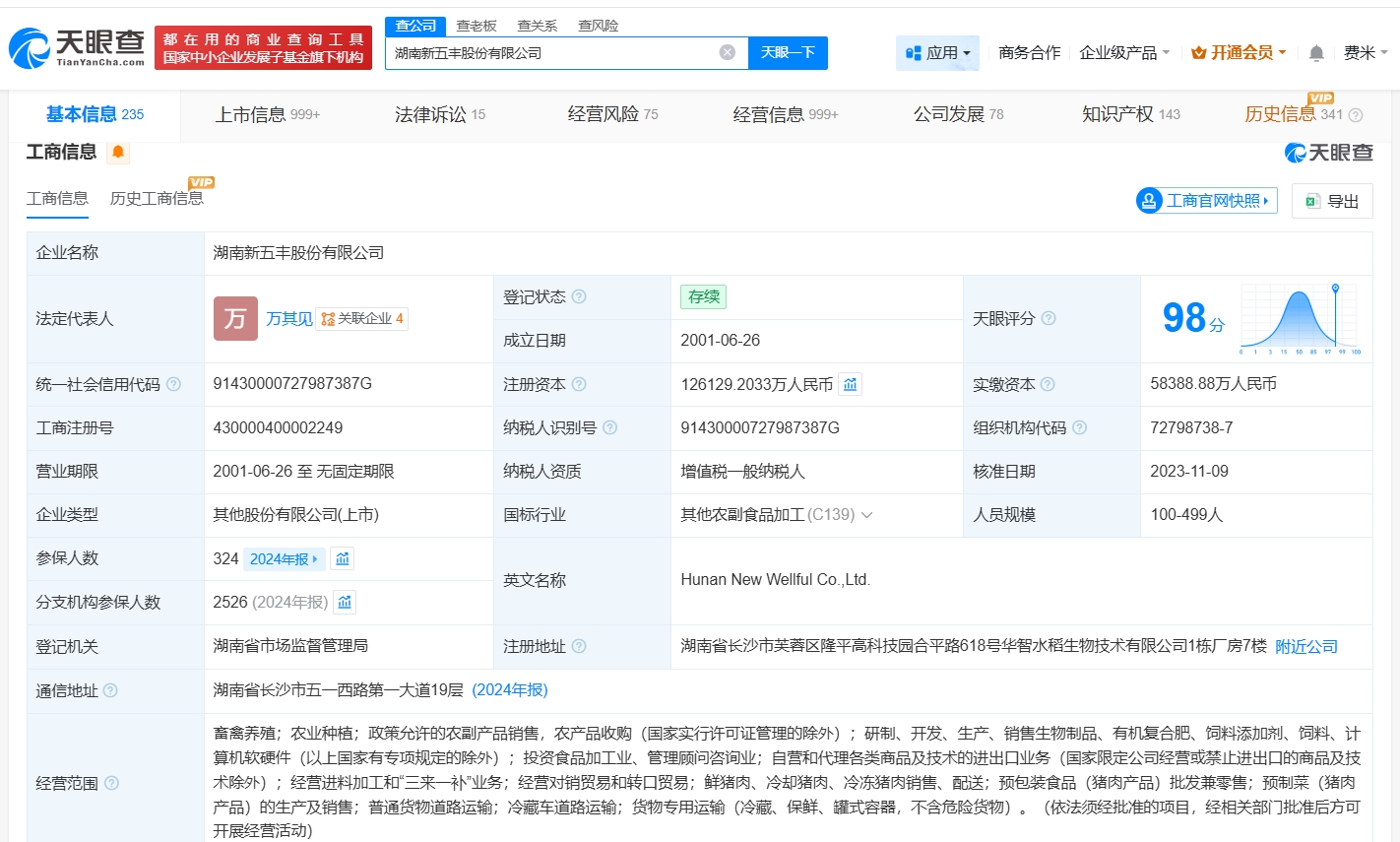 天眼查工商信息显示,湖南新五丰股份有限公司成立于2001年6月,法定代表人为万其见,注册资本约12.6亿人民币,经营范围包括鲜猪肉、冷却猪肉、冷冻猪肉销售、配送等。股东信息显示,该公司由湖南省现代农业产业控股集团有限公司、湖南省粮油食品进出口集团有限公司、湖南兴湘投资控股集团有限公司等共同持股。对外投资信息显示,该公司对外投资40余家企业,其中30余家处于存续状态,包括湖南天心种业有限公司、湖南省现代冷链物流控股集团有限公司等。