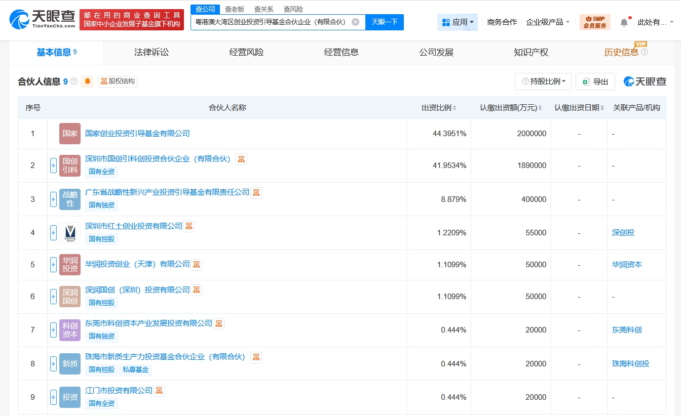 天眼查工商信息显示,近日,粤港澳大湾区创业投资引导基金合伙企业(有限合伙)成立,执行事务合伙人为深润国创(深圳)投资有限公司,出资额450.5亿人民币,经营范围为以私募基金从事股权投资、投资管理、资产管理等活动。合伙人信息显示,该基金由国家创业投资引导基金有限公司、深圳市国创引科创投资合伙企业(有限合伙)、广东省战略性新兴产业投资引导基金有限责任公司等共同出资。
