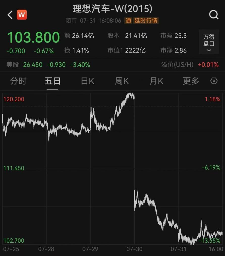 但就是这样一款让他颠覆审美的满意之作,投资者却不愿买账。发布次日上午,理想汽车港股开盘即暴跌超10%。暴跌次日,理想汽车港股股价依旧没有起色,7月31日收盘跌0.67%。