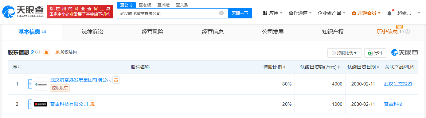 天眼查App显示,近日,武汉航飞科技有限公司成立,法定代表人为黄宏力,注册资本5000万人民币,经营范围包括航空运营支持服务、航空商务服务、信息技术咨询服务、智能无人飞行器销售等。股东信息显示,该公司由武汉航空港发展集团有限公司、普宙科技有限公司共同持股。