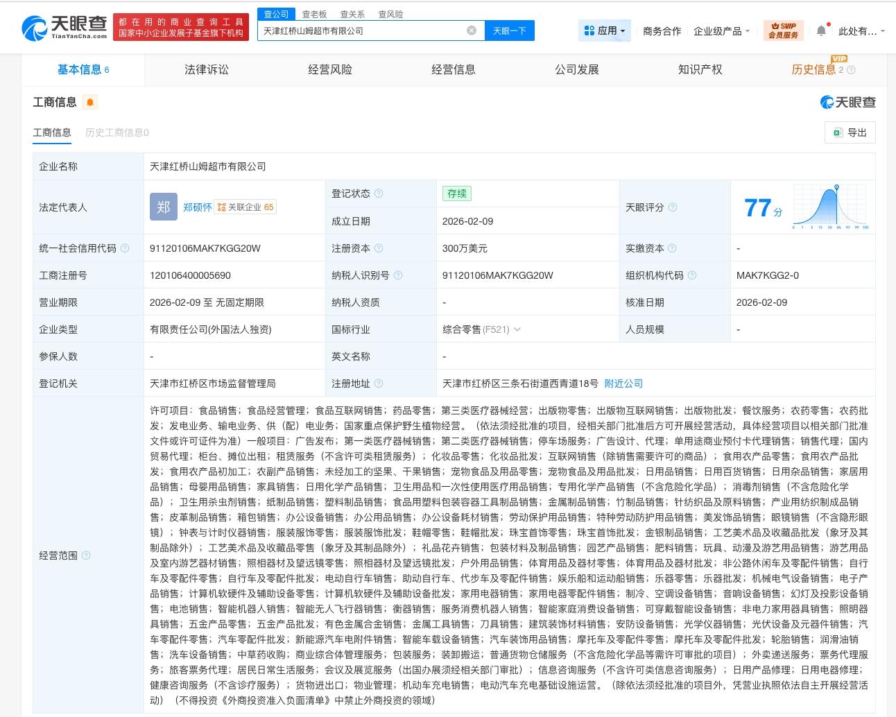 天眼查工商信息显示,近日,天津红桥山姆超市有限公司成立,法定代表人为郑硕怀,注册资本300万美元,经营范围含食品销售、食品经营管理、食品互联网销售、药品零售、出版物互联网销售、出版物批发、餐饮服务、国内贸易代理等。股东信息显示,该公司由山姆(上海)投资有限公司全资持股。