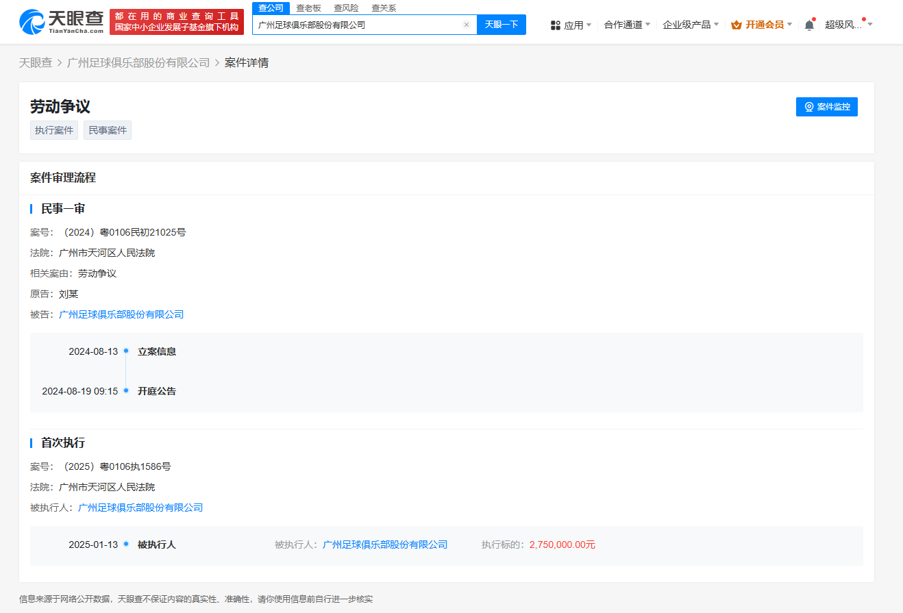 近日,广州足球俱乐部股份有限公司新增1条被执行人信息,执行标的275万元,涉及劳动争议案件,执行法院为广州市天河区人民法院。