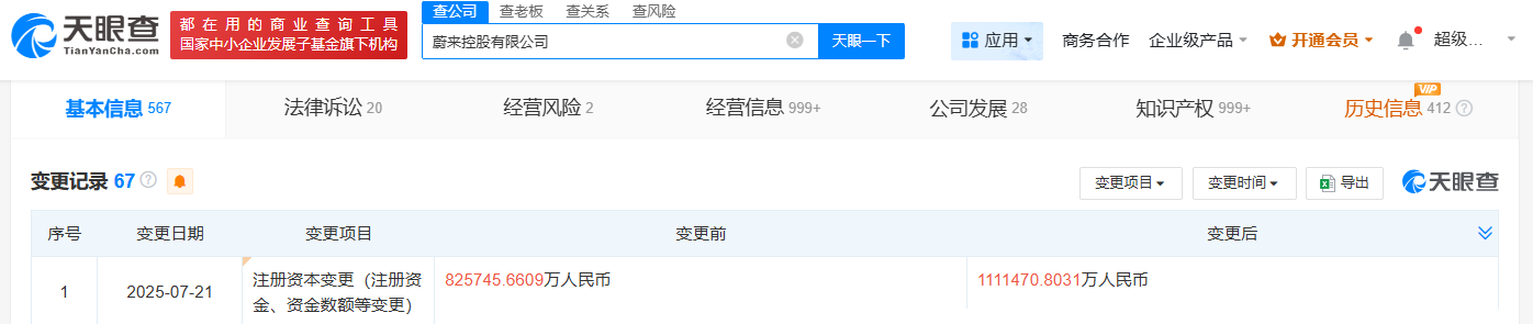 天眼查App显示,近日,蔚来控股有限公司发生工商变更,注册资本由约82.57亿人民币增至约111.15亿人民币。