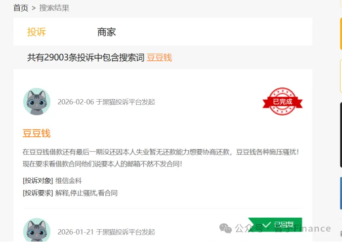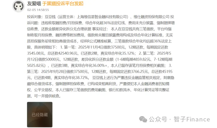 例如,2月5日有用户在黑猫投诉上反映,其在豆豆钱共有三笔借款,平台均强制收取月担保费、融担费等附加费用,且在借款前未醒目披露费用构成及综合年化计算标准,无实质担保服务却变相抬高借贷成本。