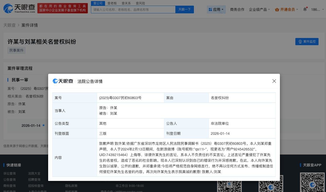 天眼查天眼风险信息显示,1月14日,法院刊登刘某向许凯致歉的声明。